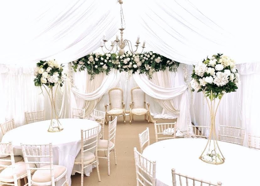 To further customise your 4x6m marquee, we offer a variety of add-on options. Set the perfect ambiance with lighting from £35, add a touch of elegance with lining at £60, and keep guests comfortable with heating from £40. For a stable and stylish surface, our carpet on board flooring is available at £145. Additionally, you can complete your setup with our marquee furniture, including tables, chairs, and luxury seating.