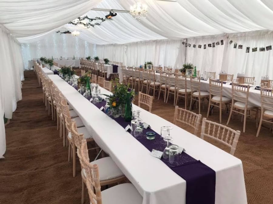 To further enhance your 6x20m marquee, we offer a selection of optional add-ons. Set the perfect ambiance with lighting starting at £70, add sophistication with marquee lining at £205, and keep your guests warm with heating options from £140. For a polished and comfortable surface, our carpet on board flooring is available at £725, providing a stable foundation for any occasion. Additionally, we offer a wide range of marquee furniture, including tables, chairs, and luxury seating, to complete your event setup.