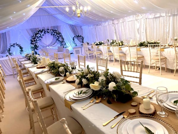 The package includes a full set of Banqueting Chairs and 5ft Round Tables, arranged to comfortably seat 40 guests. This layout allows plenty of space for service or socialising, ideal for lunches, dinners or evening gatherings.